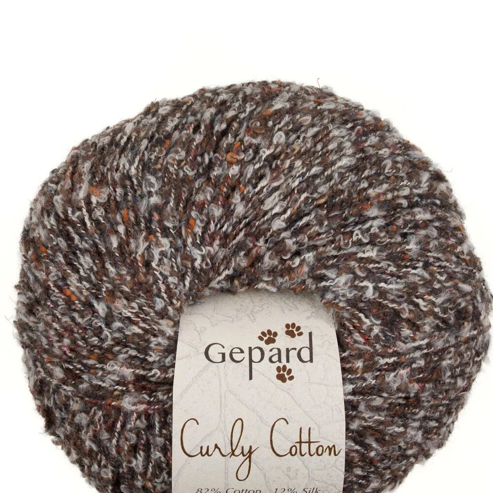 Curly Cotton firmy Gepard Garn to bardzo interesująca włóczka typu bouclé. W przeważającej większości składu to bawełna 82%, ale także jedwab 12% i wełna 6%. Specjalny proces przędzenia oraz doskonała równowaga użytych włókien tworzą włóczkę miękką, elastyczną i delikatną dla skóry, a jednocześnie niezwykle łatwą w dzierganiu. Oczka gładko przesuwają się po drutach, tworząc ciekawą fakturę.