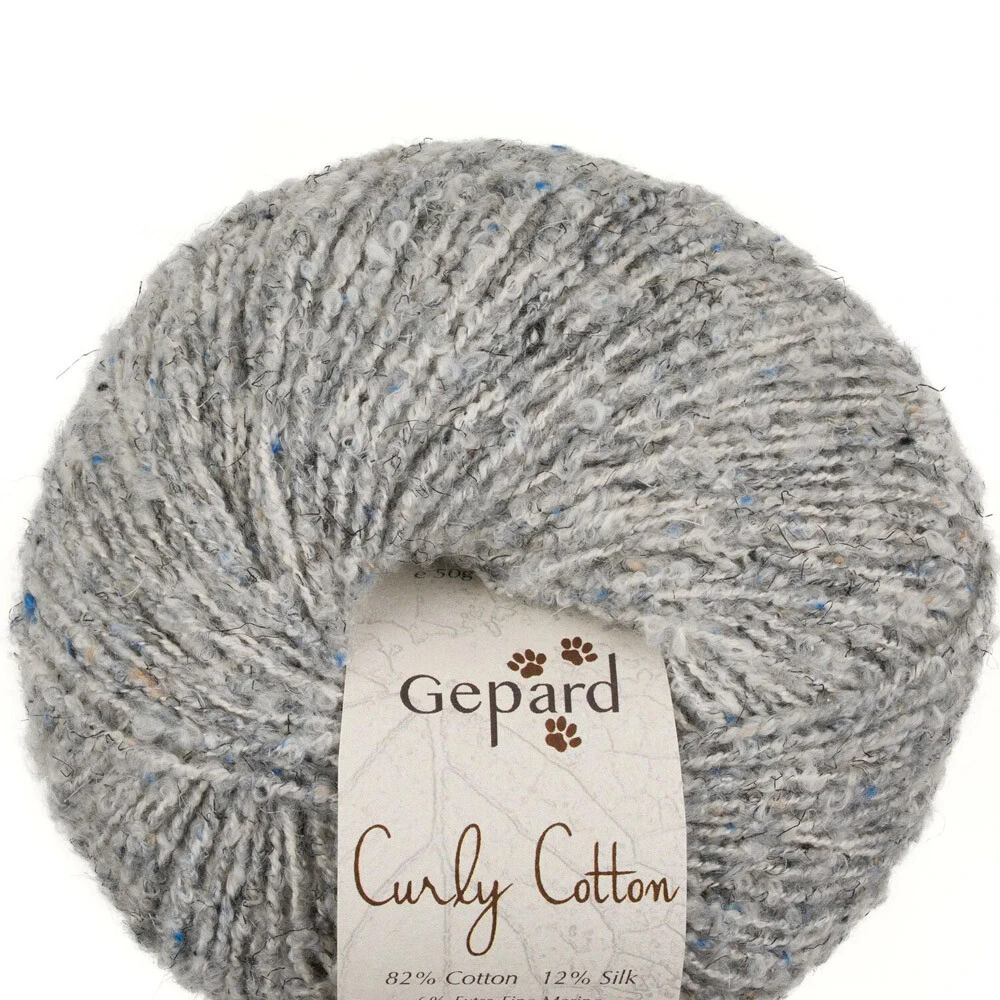 Curly Cotton firmy Gepard Garn to bardzo interesująca włóczka typu bouclé. W przeważającej większości składu to bawełna 82%, ale także jedwab 12% i wełna 6%. Specjalny proces przędzenia oraz doskonała równowaga użytych włókien tworzą włóczkę miękką, elastyczną i delikatną dla skóry, a jednocześnie niezwykle łatwą w dzierganiu. Oczka gładko przesuwają się po drutach, tworząc ciekawą fakturę.