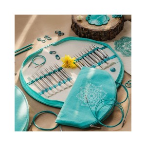Zestaw drutów z kolekcji The Mindful zawiera 12 par drutów o długości 13 cm do łączenia żyłką, wykonanych ze stali (bezpieczne dla alergików). Po połączeniu żyłka obraca się się. Druty są zapakowane w ładne etui z materiału, z nadrukowanym logo tej serii nawiązującym do mandali. Wewnątrz znajduje się dodatkowa saszetka zawierająca 4 żyłki 60 cm, 80 cm i 2x100 cm, a także miarkę grubości drutów. W środku saszetki jest także kieszonka, a w niej dodatkowe akcesoria - znaczniki w trzech rozmiarach (w sumie 40 szt), plastikowe igły do zszywania dzianiny, 2 x łączniki do żyłek, 4 x kluczyki do dokręcania żyłek, 6 x zaślepki do drutów