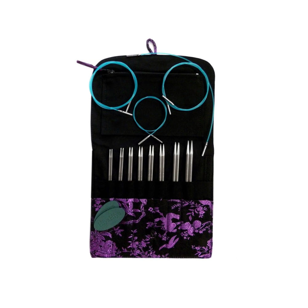 W zestawie druty wymienne o długości 4" czyli 10,16 cm w rozmiarach 2.75, 3, 3.25, 3.5, 3.75, 4, 4.5, 5, żyłki o długości 1x40 cm, 1x60 cm, 1x80 cm, 1x100 cm oraz gumka z kluczykiem ułatwiające dokręcanie drutów. Dzięki efektownemu etui można utrzymać druty w porządku, bo każda grubość druta ma swoje miejsce. W etui jest także miejsce dla żyłek i innych przydatnych akcesoriów.